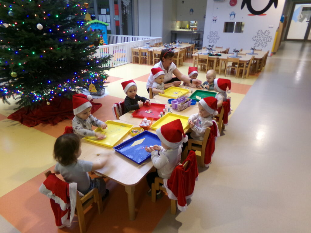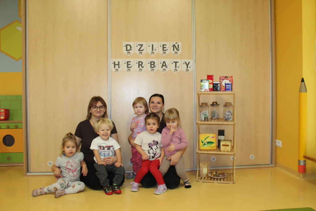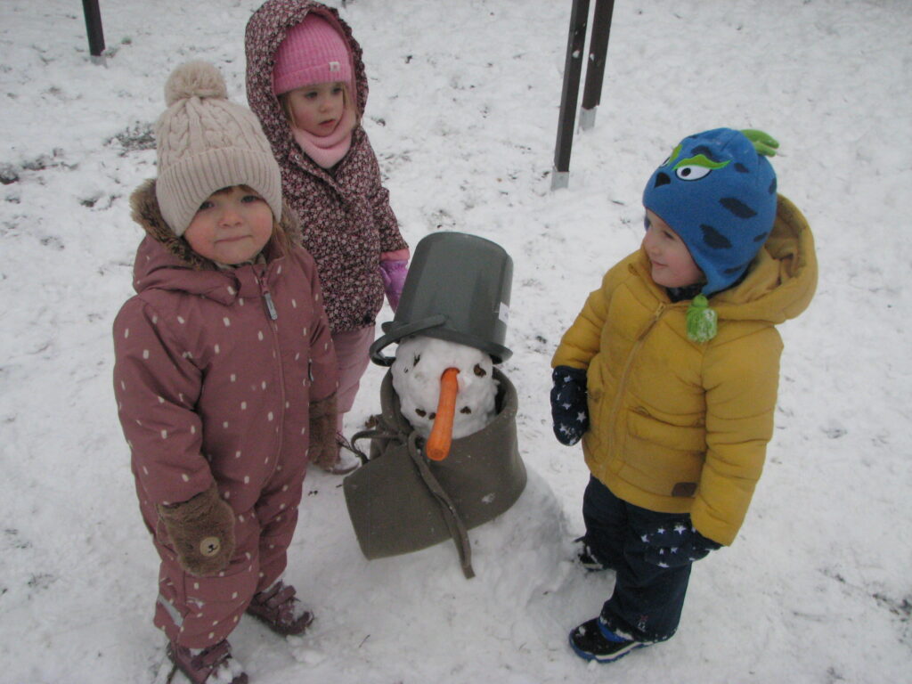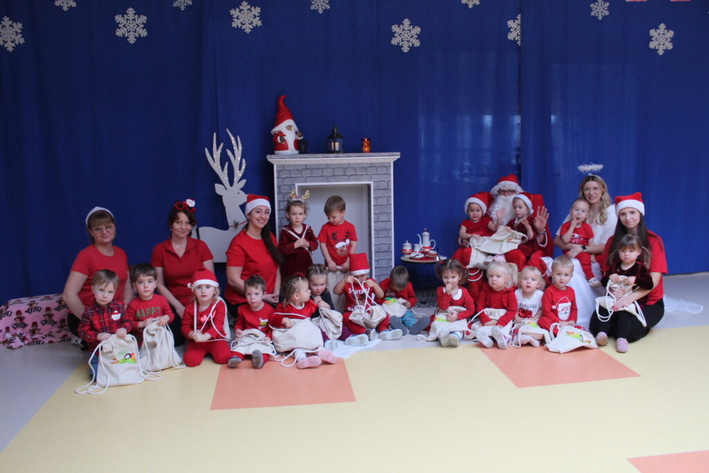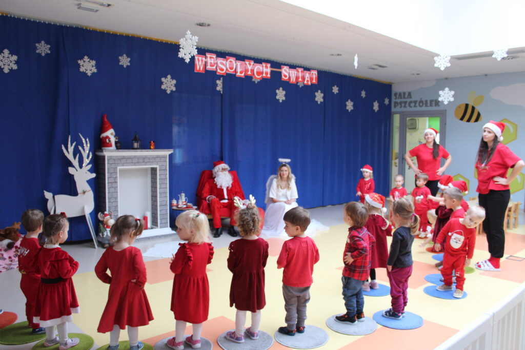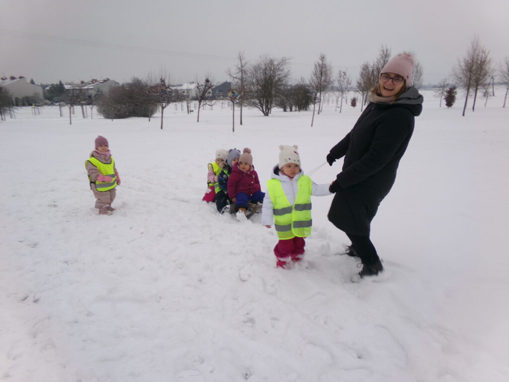 Grupa dzieci z opiekunkami w zimowej scenerii podczas występu z okazji Dnia Babci i Dziadka