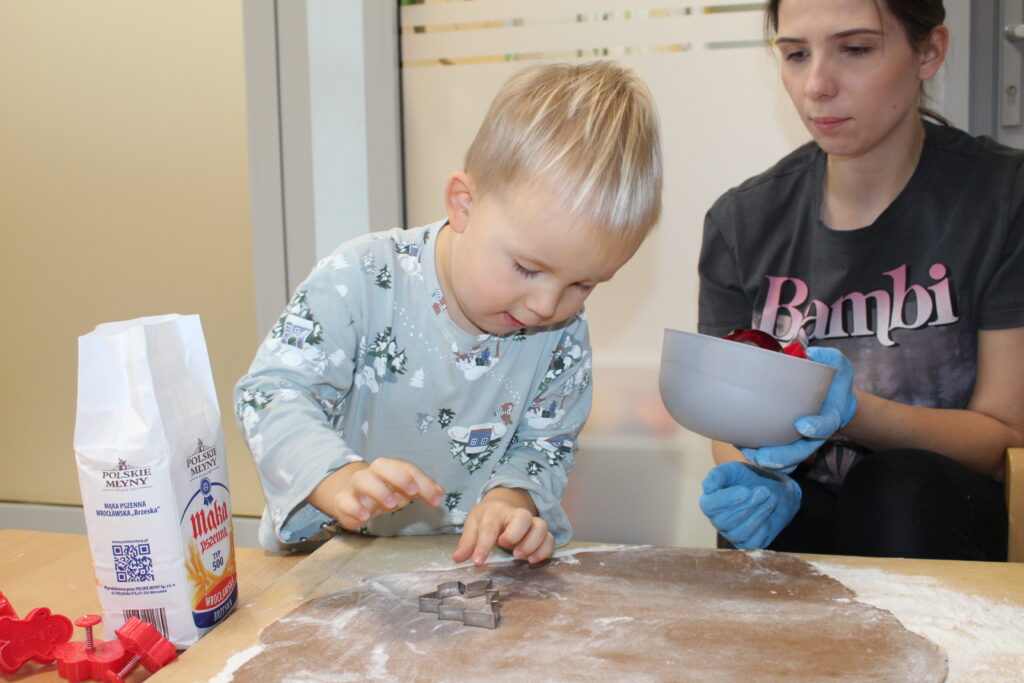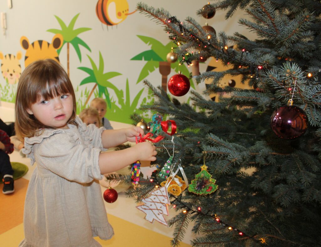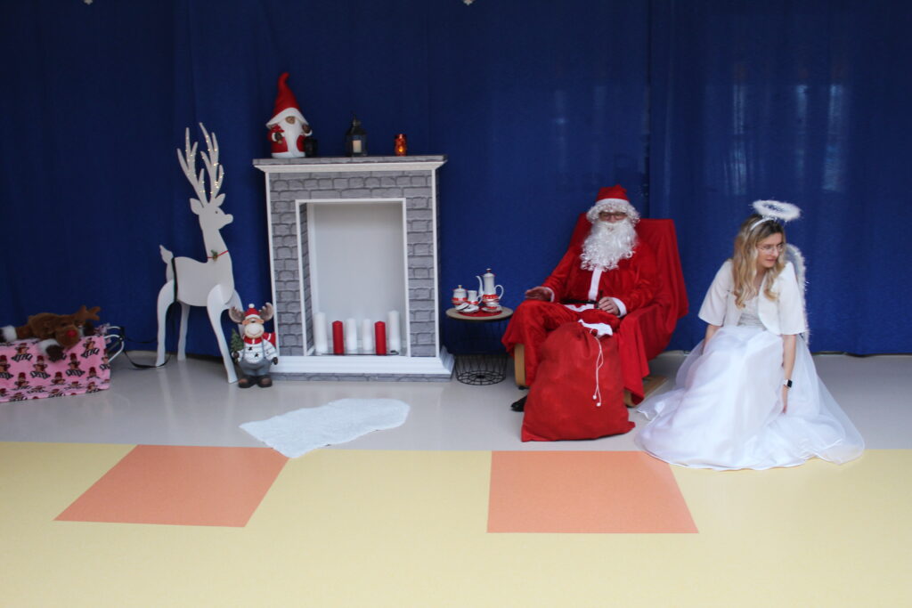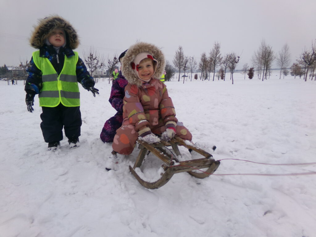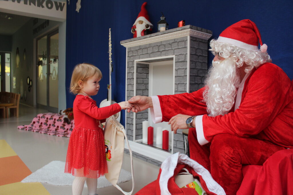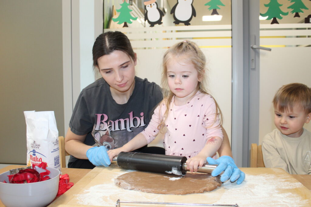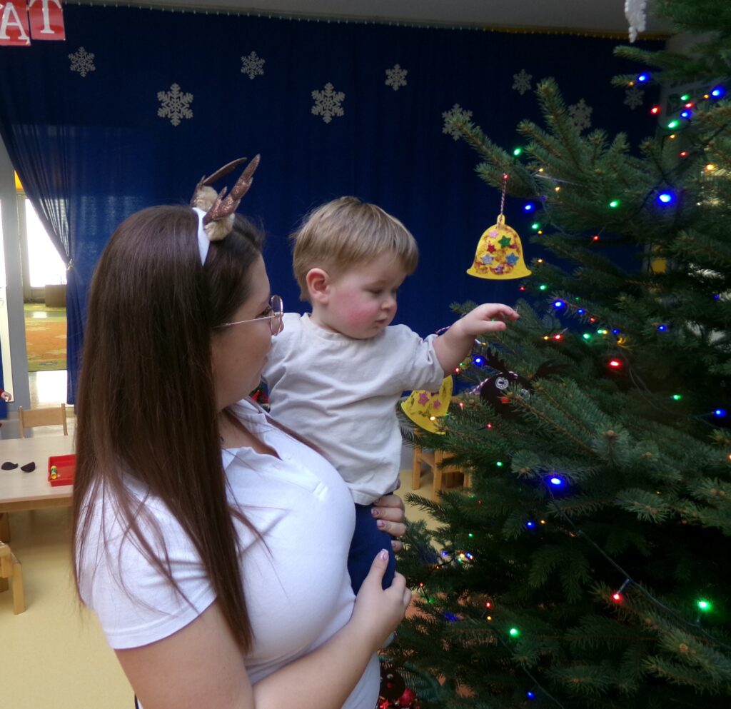 Grupa dzieci z opiekunkami w zimowej scenerii podczas występu z okazji Dnia Babci i Dziadka