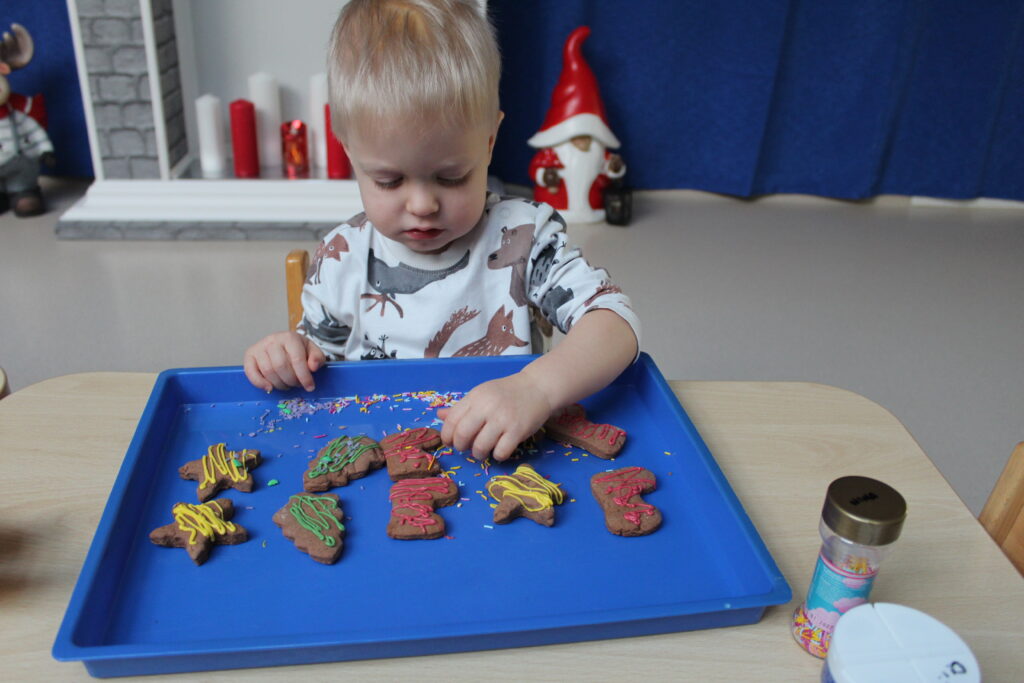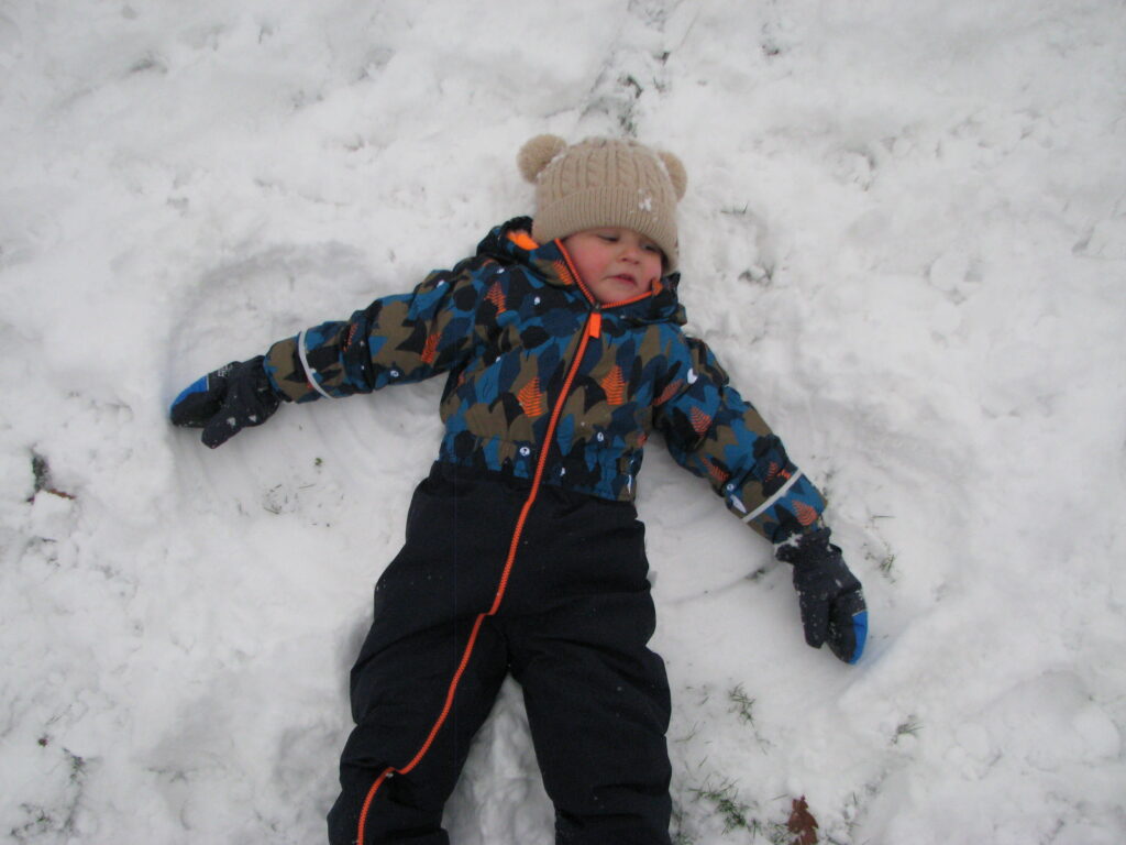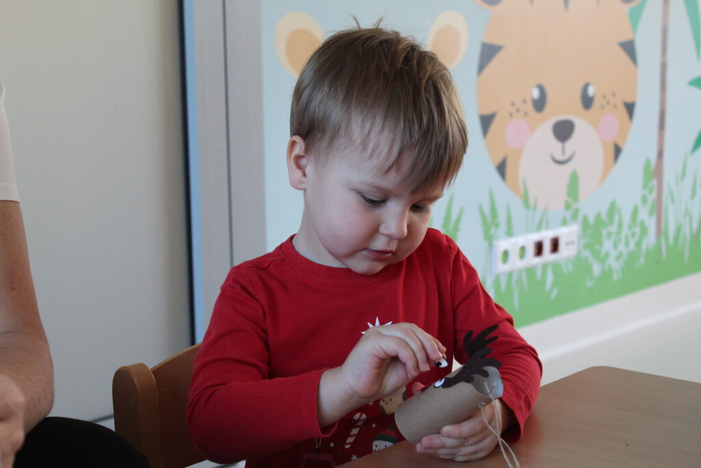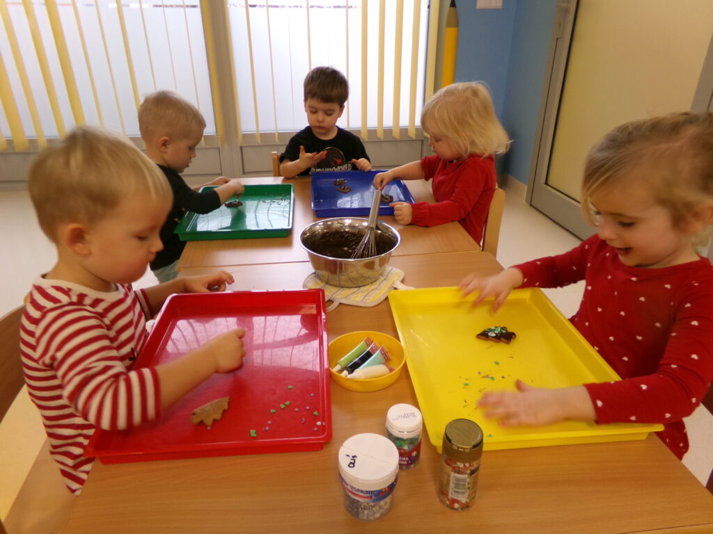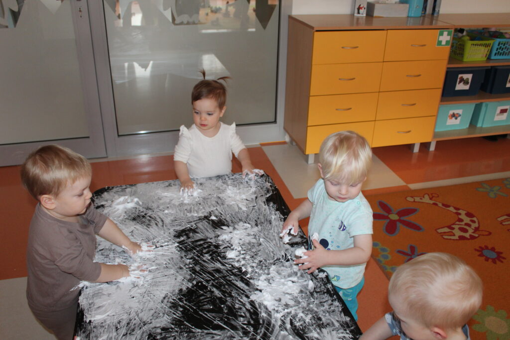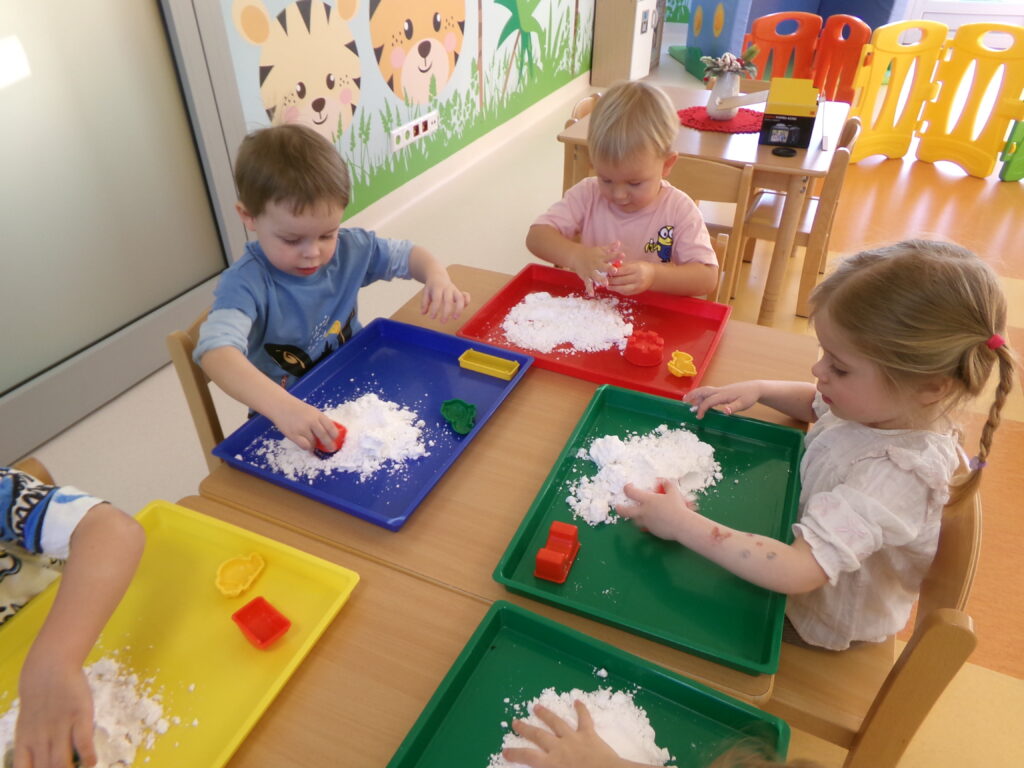Grupa dzieci z opiekunkami w zimowej scenerii podczas występu z okazji Dnia Babci i Dziadka