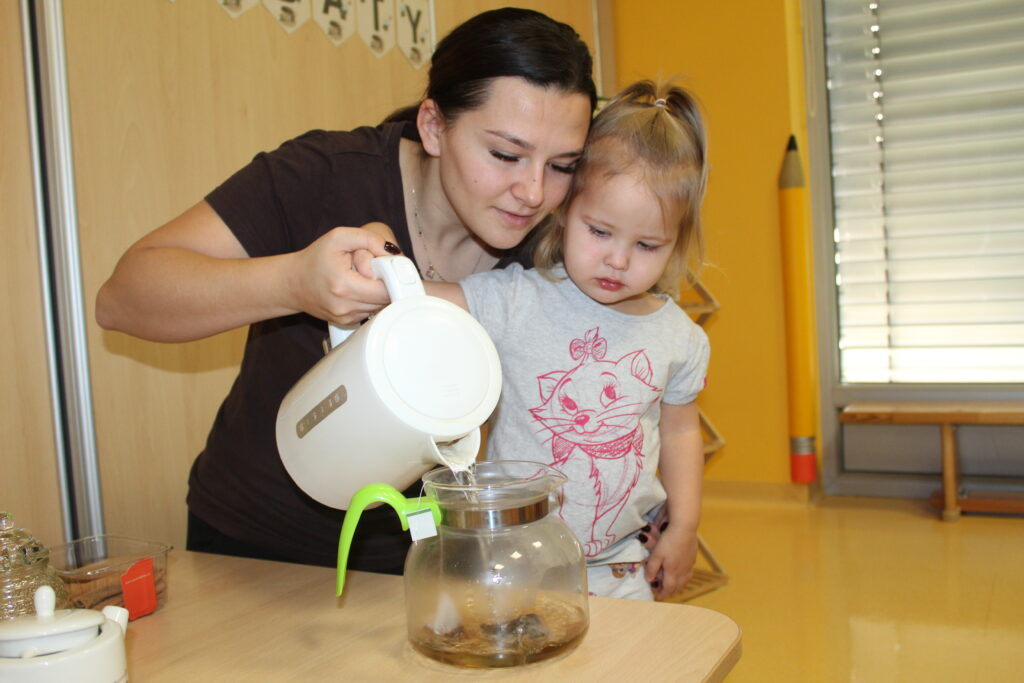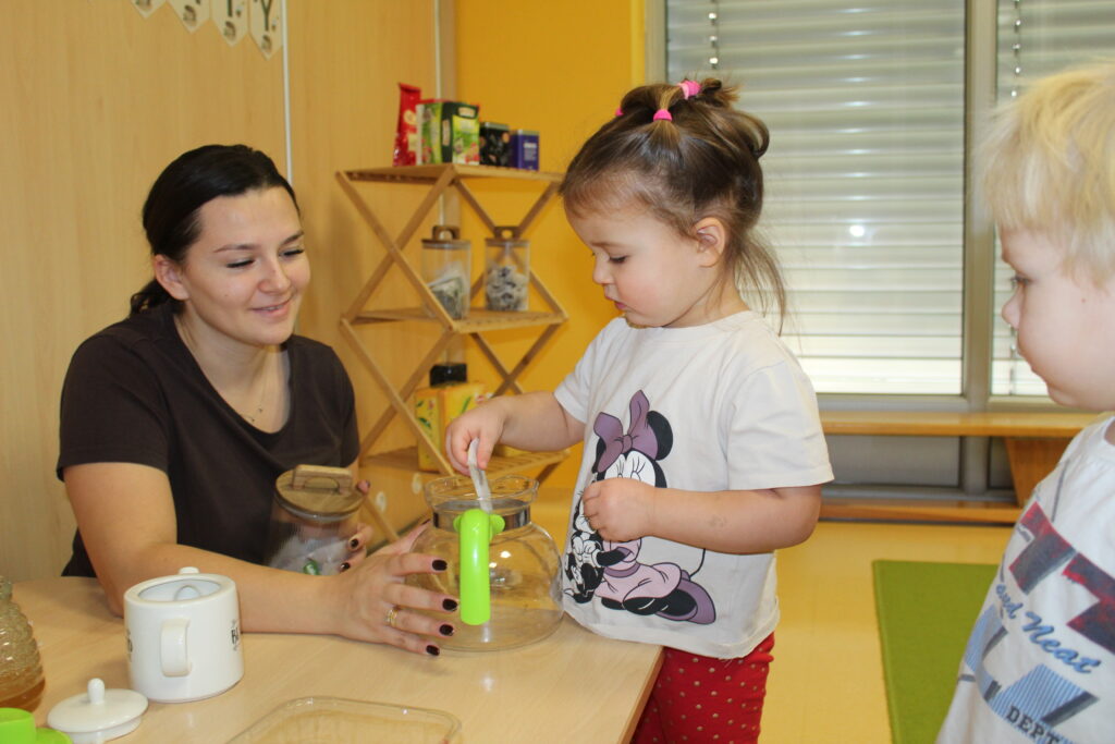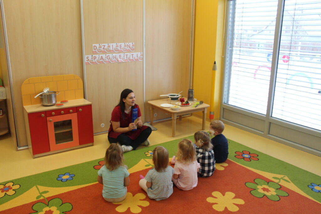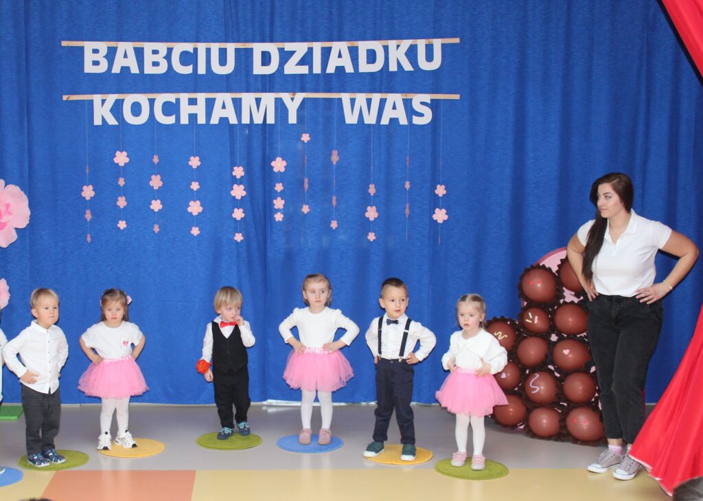 Grupa dzieci z opiekunką tańczą dla babci i dziadka